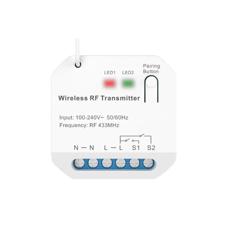 - Once the switch is pressed, the built-in transmitter of the wireless switch send the command by RF 433MHz to the receiver to achieve on/off control.